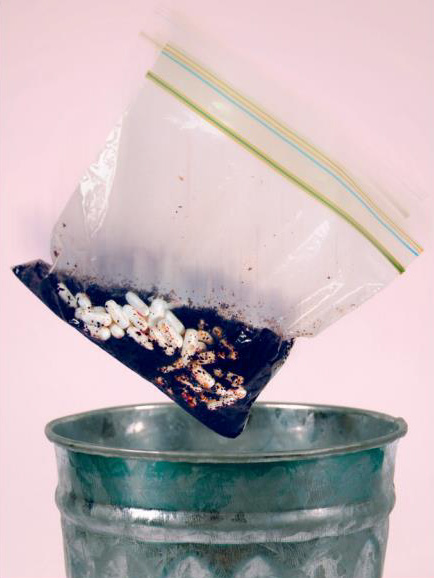 - Mix medicines (liquid or pills; do not crush tablets or capsules) with an unappealing substance such as dirt, cat litter, or used coffee grounds.