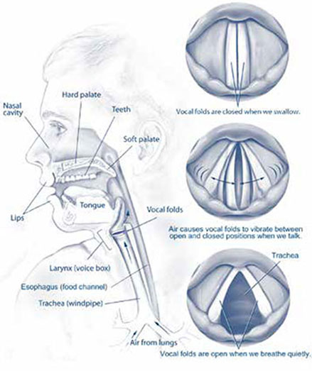 The larynx, or voice box, is located behind the Adam’s Apple, below the base of the tongue and above the trachea, or windpipe. The vocal folds consist of muscle and mucosa. The vocal folds are open when you’re not speaking so you can breathe. Speaking causes the vocal folds to come together in the midline. The air pressure produced by the lungs causes them to vibrate and produce sounds (see diagram).