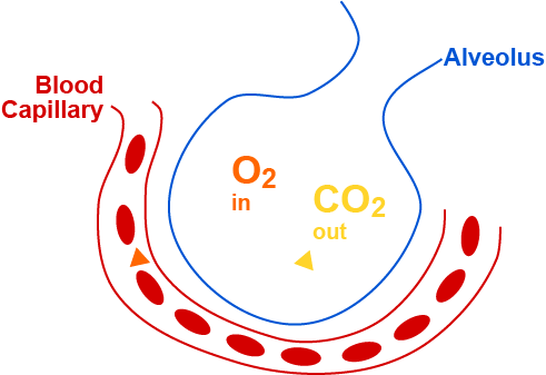 The lower respiratory system is the area below the larynx which includes the windpipe (trachea) and the lungs. When we inhale, air goes through the nose or mouth, inferiorly through the larynx and trachea on its way to the lungs. The air enters the lungs via the right and left bronchi which gradually decrease in size and end as alveloli, tiny air sacs. The alveoli are the areas where blood capillaries are found exchanging oxygen (O2) for carbon dioxide (CO2).